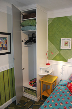 Two identically equipped closets hold multiple kinds of hangers, extra pillow and extra blankets. There's also a laptop desk in each one.