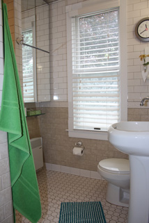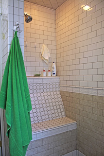 The sparkling bathroom is fully ceramic-tiled. The shower has a bench seat! A storage cabinet will hold your toiletries. In short, it's everything you'll need to feel fresh and ready to go (even a hair dryer is provided!)