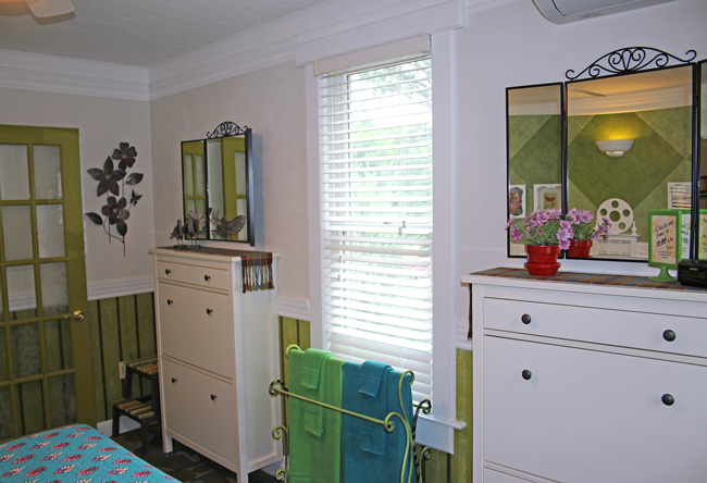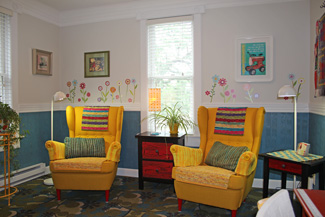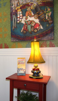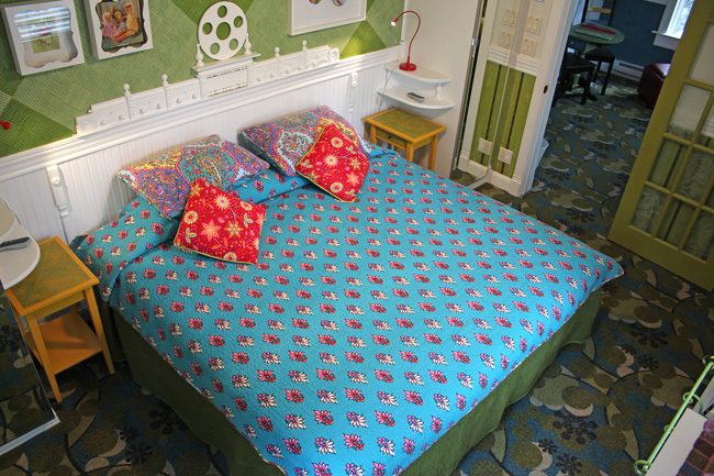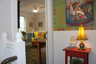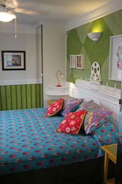 It's a whimsical retreat! For travelers who appreciate the textile arts and crafts, the whimsy starts at the entry door on the second-floor. Custom-painted and textured walls and movie-theater carpet create a one-of-a-kind environment so you know you're going to feel comfortable and creative! Built-in night lights in all rooms will keep you sure-footed even when it's dark.